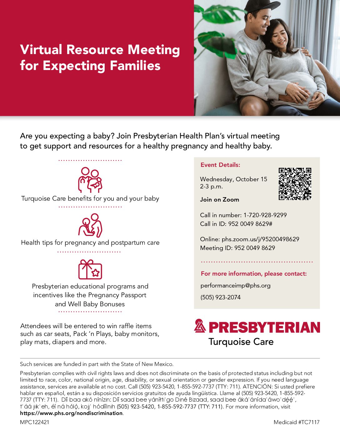Presbyterian Turquoise Care members who are pregnant or expecting a baby can join our virtual meeting to learn more about benefits for you and your baby, health tips for pregnancy and postpartum care, and education programs such as the Pregnancy Passport and Baby Bonuses. Attendees will be entered to win raffle items such as car seats, Pack n Plays, baby monitors, playmats and more.